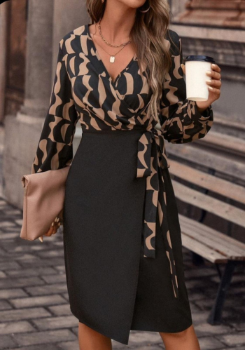 - Baskılı Kadın Zarif Duruş Uzun Kollu Kruvaze Yaka Dijital Fiyonk Detay Atlas Kumaş Elbise