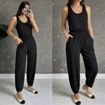 Kadın Askılı Yuvarlak Yakalı Cepli Viskon Tulum