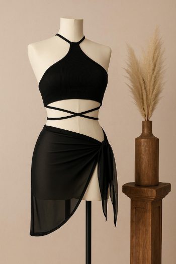 - Kadın Kombin Şıklığı Siyah Çapraz Bağlamalı Crop ve Pareo 2’li Set