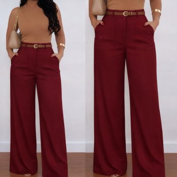 Kadın Yüksek Bel Geniş Paça Detaylı Cepli Ithal Krep Pantolon