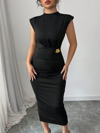 Kadın Yarı Balıkçı Yaka Kısa Kollu çicek Aksesuar Detaylı Midi Dalgıç Elbise