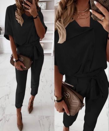 Kadın Zarif Dokunuş Kısa Kollu Yakalı önden Düğmeli Bürümcük Bluz Ve Pantolon İkili Takım