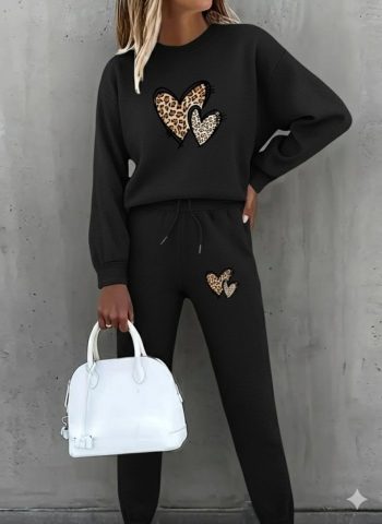 şardonlu Kadın Sıcak Tutan Uzun Kollu Bisiklet Yaka Kalp Desenli üç İplik Bluz Ve Pantolon İkili Takım