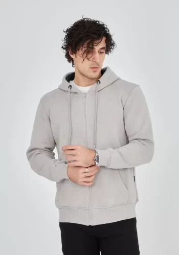 Unisex Günlük Stil Gri Tam Fermuarlı Cepli Kapüşonlu Sweatshirt