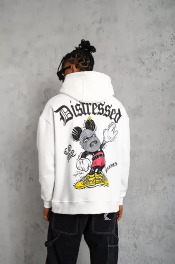 - Üç İplik Şardonlu Erkek Sıcak Tutan Beyaz Sırt Baskılı Kapüşonlu Sweatshirt