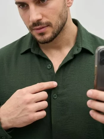 Erkek Aerobin Kumaş Oversize 4 Mevsim Uzun Kollu Rahat Kalıp Gömlek – Haki