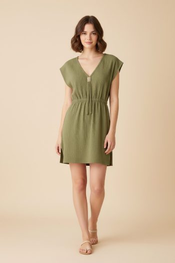 Kadın Zarif Duruş Haki Yanları Yırtmaçlı Tokalı V Yaka Mini Plaj si Elbise