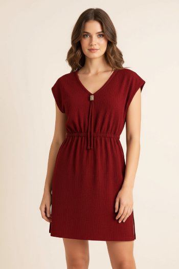 Kadın Zarif Duruş Bordo Yanları Yırtmaçlı Tokalı V Yaka Mini Plaj si Elbise