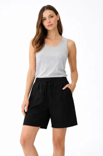 Keten Kumaş Cepli Rahat Kesim Bel Lastikli Şort – Siyah