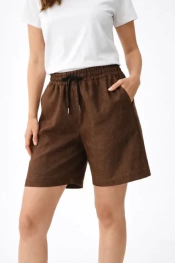 Keten Kumaş Cepli Rahat Kesim Bel Lastikli Şort – Kahverengi