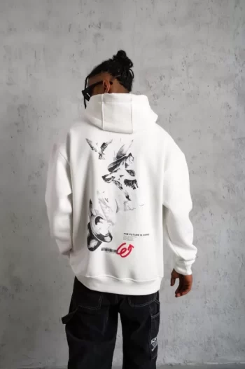 Şapkalı Güvercin Baskılı Erkek Beyaz Kapüşonlu Sweatshirt