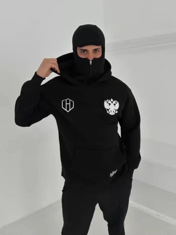Şapkalı Güvercin Baskılı Erkek Siyah Kapüşonlu Sweat