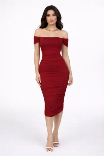 Madonna Yaka Drapeli Midi Elbise Likralı Vücuda Oturan Davet Elbisesi – Bordo
