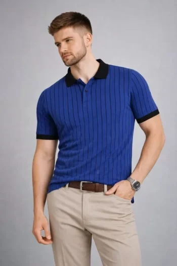 Erkek Günlük Stil Saks Mavisi Polo Yaka Çizgili Kısa Kol Düğmeli Yazlık Tişört