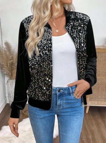 Pulpayetli Kadın Şehir Stili Uzun Kollu önü Açık Fermuarlı Kadife Ceket