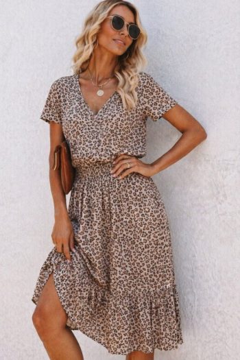Kadın Kısa Kollu V Yakalı Beli Lastikli Yırtmaçlı Uzun Leopar Desenli Süprem Elbise