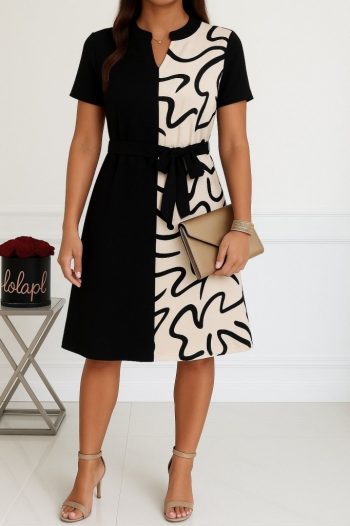 Kadın Kısa Kollu V Yakalı çift Renkli Desenli Beli Kuşaklı Atlas Elbise