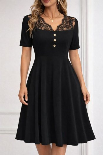 Kadın Kısa Kollu Dantel V Yakalı Düğmeli Kısa Janjan Krep Elbise