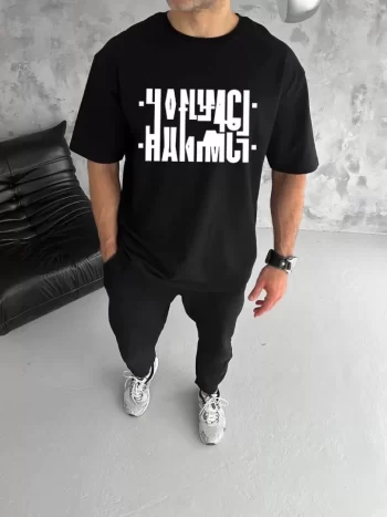 Baskılı Unisex Günlük Stil Siyah İmza Tasarım Bol Kesim Tişört