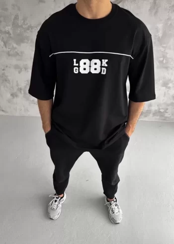 Baskılı Unisex Günlük Stil Siyah Kol ve Göğüs Çift Yön Oversize Tişört