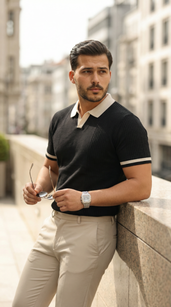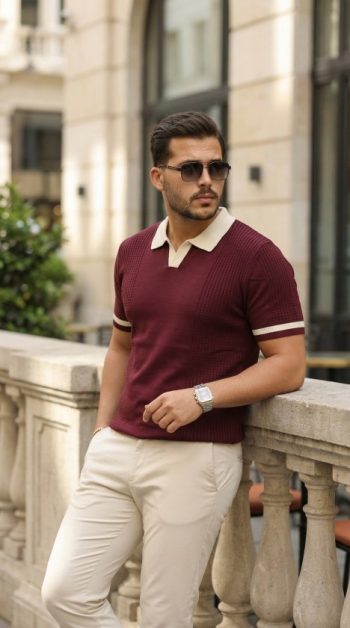 Desenli Erkek Kahverengi Düğmeli Yaka Triko Dokuma Tişört Yazlık Şık Günlük Triko Tişört