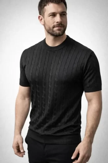 Desenli Erkek Günlük Stil Siyah Yazlık Triko Dokuma Kısa Kol Bisiklet Yaka Örgü Tişört