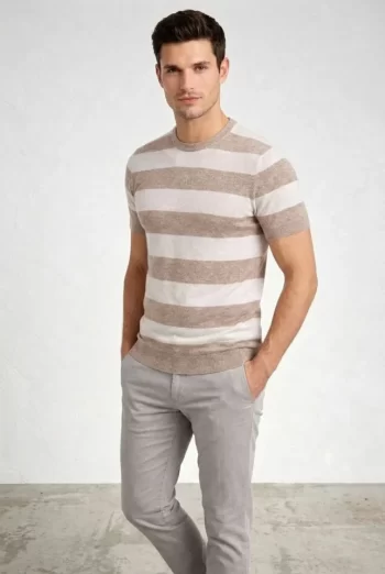 Erkek Günlük Stil Bej Çizgili Triko Dokuma Bisiklet Yaka Tişört