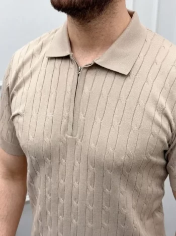 Erkek Günlük Stil Bej Yazlık Triko Saç Örgü Kısa Kol Polo Yaka Fermuarlı Tişört