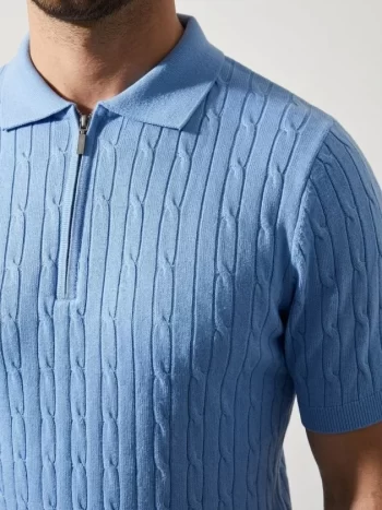 Erkek Günlük Stil Bebe Mavisi Yazlık Triko Saç Örgü Kısa Kol Polo Yaka Fermuarlı Tişört