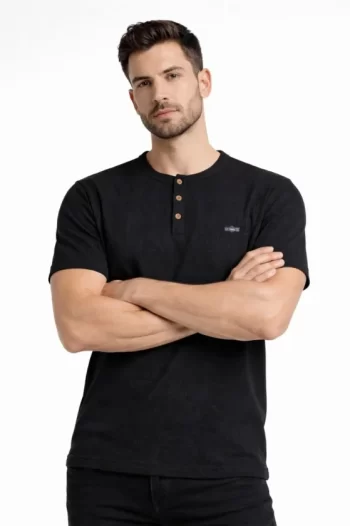Waffle Erkek Günlük Stil Siyah Dokulu Likralı Henley Yaka Düğmeli Regular Fit Kısa Kollu Tişört