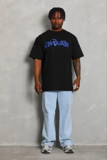 Baskılı Erkek Siyah Wafıl Kumaş Regular Kalıp Bisiklet Yaka Günlük Basic Tişört