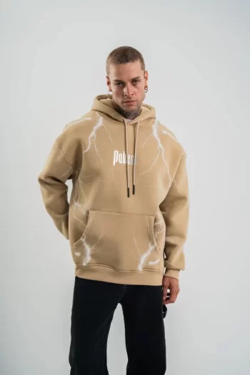 - Baskılı Erkek Salaş Stil Bej Şimşek Üç İplik Pamuklu Kanguru Cepli Double Oversize Hoodie Kapüşonlu Sweatshirt