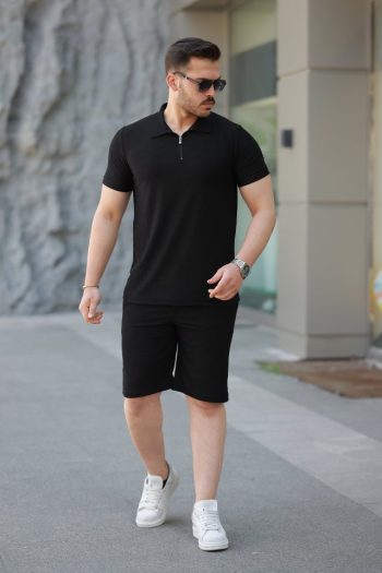 Erkek Kombin Şıklığı Siyah Nakış Detaylı Penye Şortlu Takımı () 2’li Set