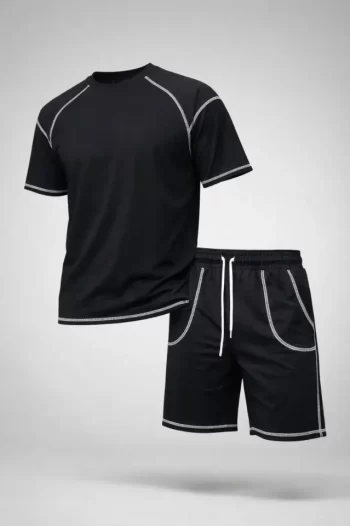 Erkek Rahat Kullanım Siyah Spor Tişört Kontrast Dikiş Detaylı Ovarsize Rahat Kalıp Şort Takım