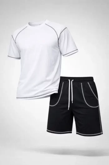 Erkek Rahat Kullanım Beyaz Spor Tişört Kontrast Dikiş Detaylı Ovarsize Rahat Kalıp Şort Takım