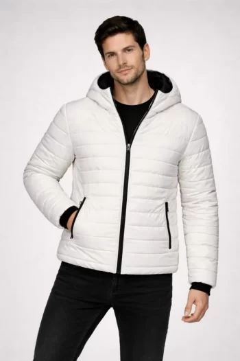 Erkek Sokak Stili Krem Şişme Kapüşonlu Fermuarlı Mont Su Itici Kapitone Astarlı Kumaş Cepli Kışlık Rahat Kalıp