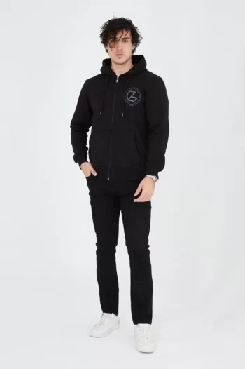 - Grafik Baskılı Erkek Sıcak Tutan Siyah Fermuarlı Kapüşonlu Polar Hırka