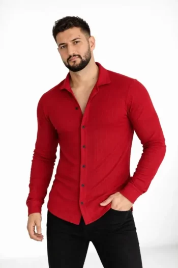 - Waffle Kumaş Erkek Rahat Kullanım Bordo Kısa Kollu Gömlek Regular Fit Yazlık İkili Set Şort Takım