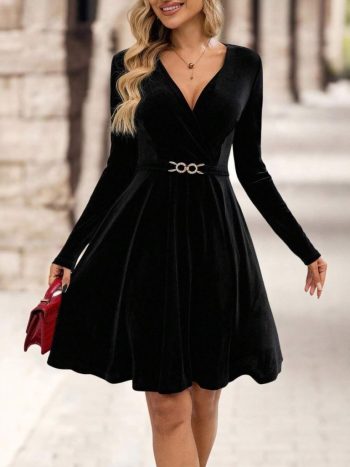 Kadife Kadın Zarif Duruş Uzun Kollu Kruvaze Yakalı Toka Detaylı Mini Elbise