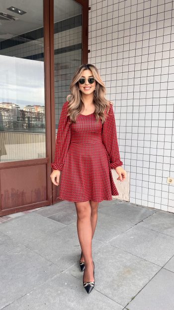 - Modal Kadın Zarif Duruş Uzun Kollu Kare Kalp Yakalı Mini Elbise