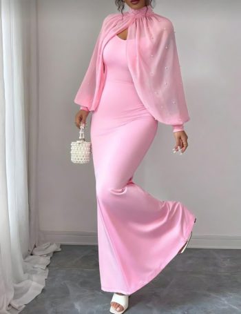 - Dalgıç Kadın Zarif Duruş Balıkçı Yaka İnci Ve Tül Detay Kumaş Maxi Boy Elbise