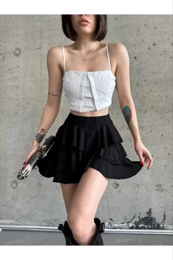 Kadın Siyah Siyah Katlı Mini Fırfıtlı Lastikli Yüksel Bel, Volanlı Tasarım, Rahat Kalıp, Günlük Ve Şık Kombinelere Uygun Yazlık Etek