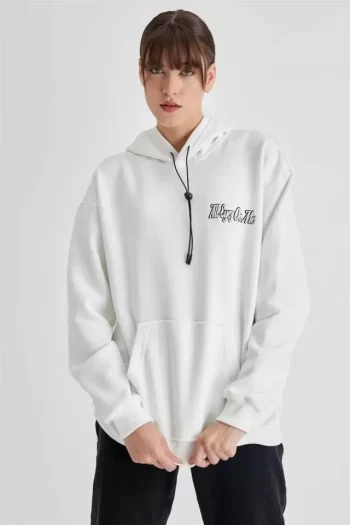 - Sırt Baskılı Kadın Sokak Stili Beyaz Kapüşonlu Üç İplik Oversize Sweatshirt