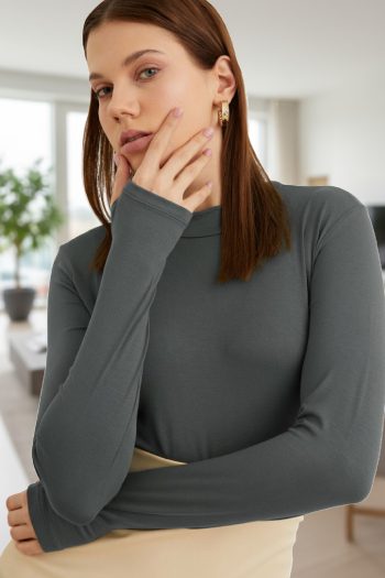 Kadın Modern Stil Antrasit Gri Parmak Detaylı Esnek Uzun Kollu Body