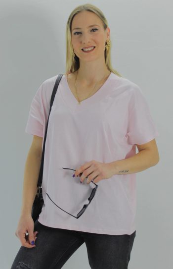 Kadın Günlük Stil Geniş V yaka Açıkpembe Tişört