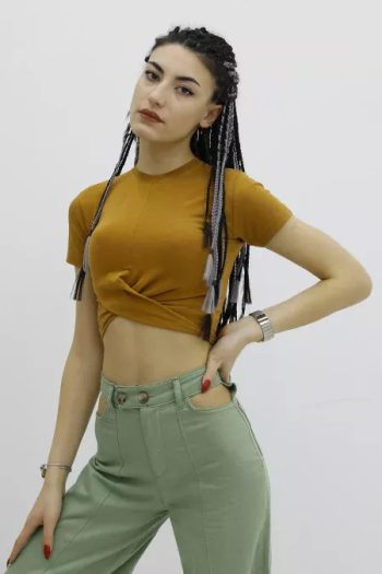 Kadın Günlük Stil Önü Büzgülü Bisiklet Yaka Taba – P-019963 Tişört