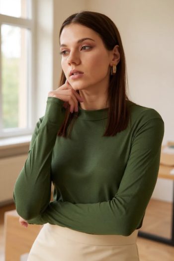 Kadın Modern Stil Haki Yeşili Parmak Detaylı Esnek Uzun Kollu Body