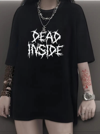 Baskılı Kadın Salaş Stil Siyah Oversize Bisiklet Yaka Tişört