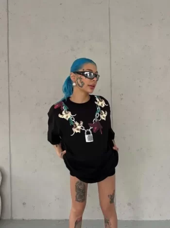 Baskılı Kadın Siyah Bisiklet Yaka Ön Kısa Kollu Streetwear Günlük Basic Pamuklu Tişört