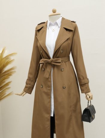 - Kadın Modern Stil Astarlı Kemerli Trenckot -Taba